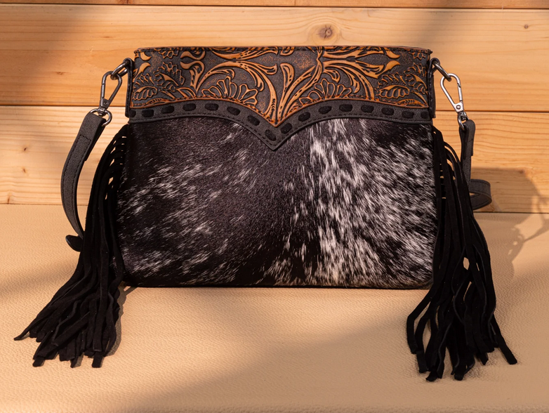 Trinity Ranch Floral Tooled Hair-On Cowhide Crossbody - Black