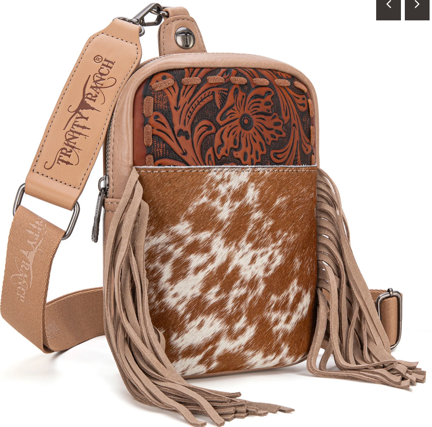 Trinity Ranch Genuine Hair-On Cowhide Tooled Fringe Sling Bag - Tan