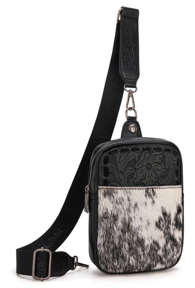 Trinity Ranch Genuine Hair-On Cowhide Tooled Sling Bag - Black